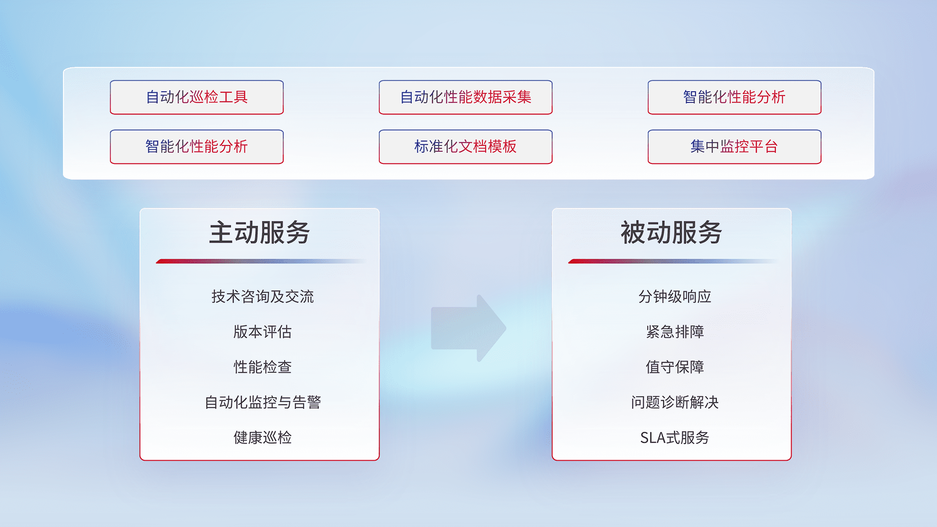 智能化工具和标准化文档,,保障服务质量,,,提供主动服务(包含技术咨询、、、版本评估、、、性能检查、、、自动化监控与告警、、、、健康巡检)和被动服务包含(分钟级响应、、紧急排障、、值守保障、、、问题诊断解决、、、、SLA服务)。。。